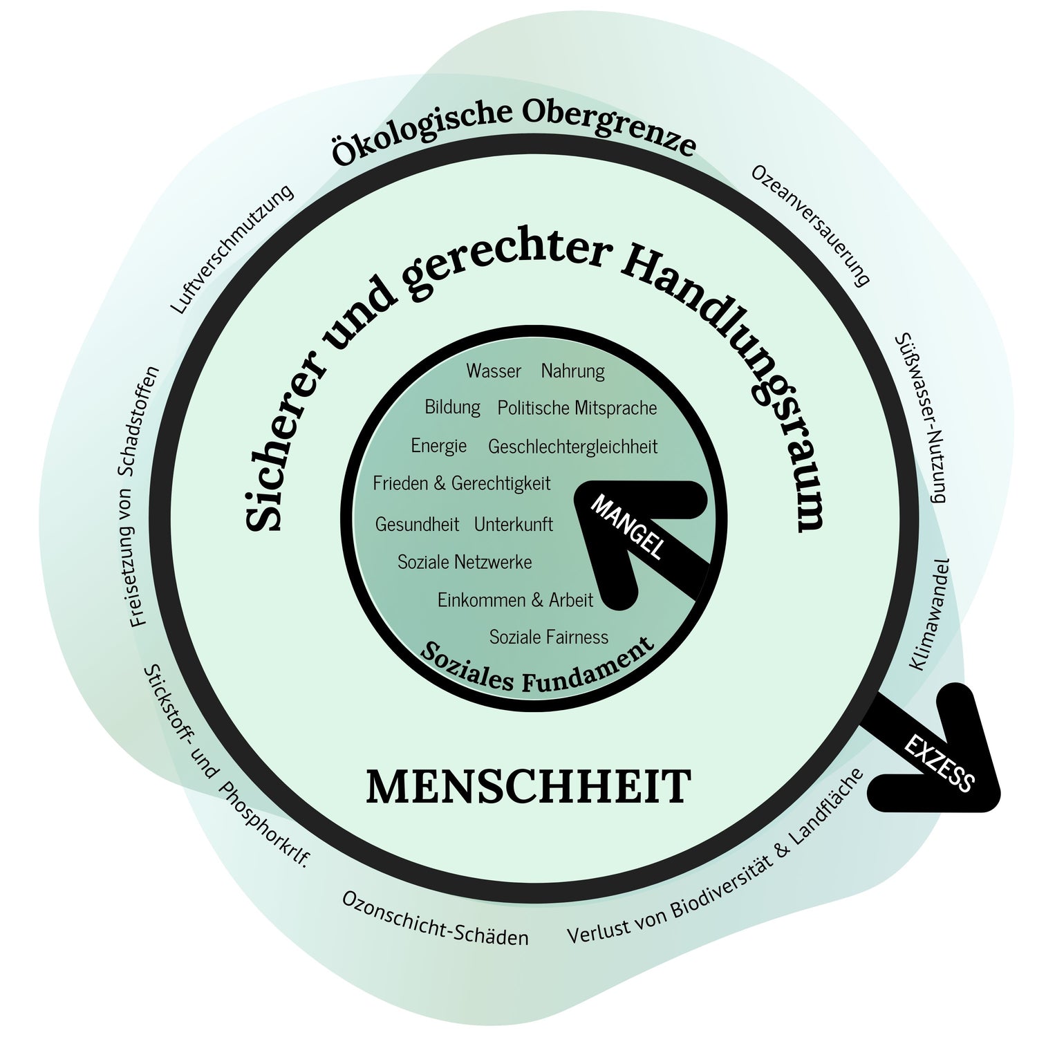 Das Modell bewertet die Leistung einer Wirtschaft danach, inwieweit die Bedürfnisse der Menschen erfüllt werden, ohne die ökologische Obergrenze zu überschreiten.